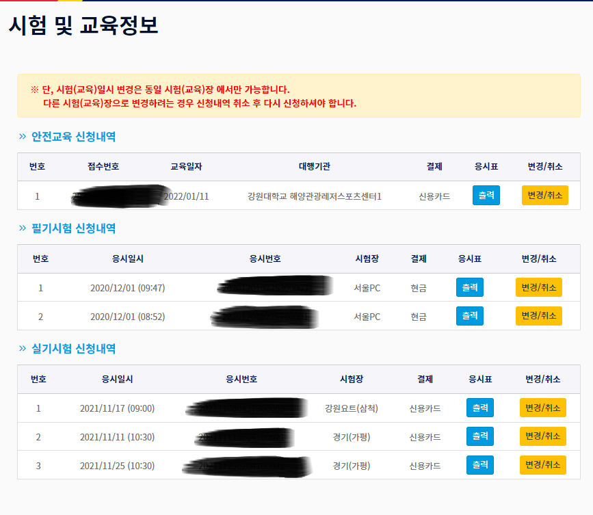 또 다른 페이지에는 그동안 봐왔던, 필기시험, 실기시험 그리고, 안전교육 신청 내용이 쭈~ 욱 나와 있네요.